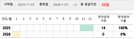 계약기간은 2025년 11월 25일부터 2026년 1월 23일까지 총 공급기간은 59일이다. 이번에 체결한 공급계약 금액은 최근 매출액 142억1329만원 대비 10.1% 규모다.