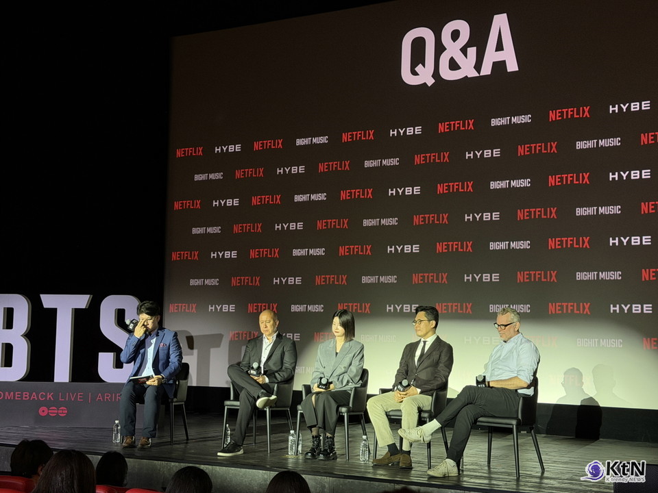 넷플릭스는 20일 서울 종로구 씨네큐브 광화문에서 <BTS 컴백 라이브: ARIRANG> 사전 미디어 브리핑을 열고 공연의 기획 방향과 생중계 구상을 공개했다. 이날 브리핑에는 브랜든 리그 넷플릭스 논픽션 시리즈 및 스포츠 부문 VP, 개럿 잉글리쉬 <BTS 컴백 라이브: ARIRANG> 총괄 프로듀서, 김현정 빅히트 뮤직 VP, 유동주 하이브 뮤직그룹 APAC 대표가 참석했다. 현장 진행은 조현준 넷플릭스 코리아 디렉터가 맡았다.