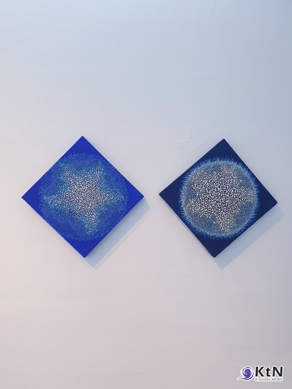 전시 공간 구성 역시 주목할 만하다. 깊이 있는 코발트 블루와 아이보리 톤의 벽면, 다채로운 점군(點群)으로 구성된 작업들은 ‘질서 속 혼돈’의 감각을 강화하며, 관람자는 일정한 거리감을 유지한 채 감각적 몰입을 경험하게 된다. 특히 전시 제목이자 대표작인 '푸가' 시리즈는, 반복과 중첩이 시각적 리듬을 이루는 동시에 ‘우주의 고요함’과 ‘생명의 격동’을 동시에 담아낸다.