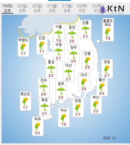 이번 비로 인해 낮 기온도 큰 폭으로 떨어졌다. 서울은 오늘 한낮 기온이 17도에 머물 예정이며, 어제 30도를 넘나들었던 대구도 오늘은 26도로 낮아졌다. 오전 8시 기준 서울은 15.8도, 울산은 19.2도로 기록됐다. 대전과 광주는 한낮 최고기온이 25도까지 오를 전망이다.
