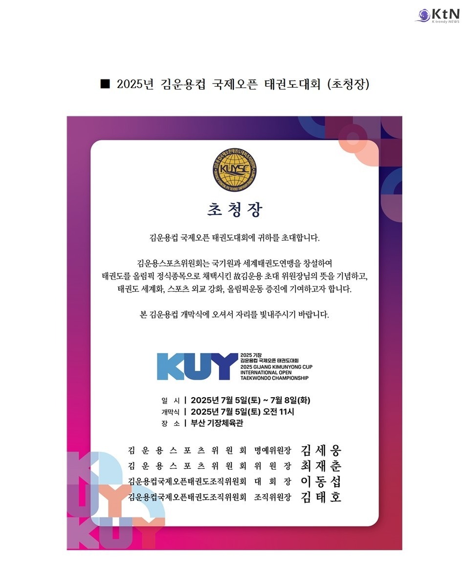 [KtN 임우경기자] 세계 태권도인의 이목이 집중되는 ‘2025 김운용컵 국제오픈태권도대회’가 7월 5일부터 8일까지 4일간 부산광역시 기장군 기장실내체육관에서 성대히 개최된다.